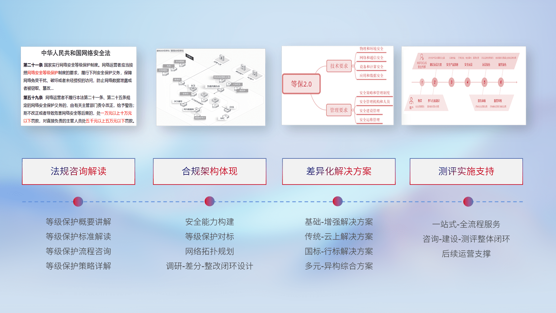 通过专业的法律咨询解读、、合规架构体现、、差异化解决方案、、测试实施支持等服务,,,为客户量身打造等保合规体系。。